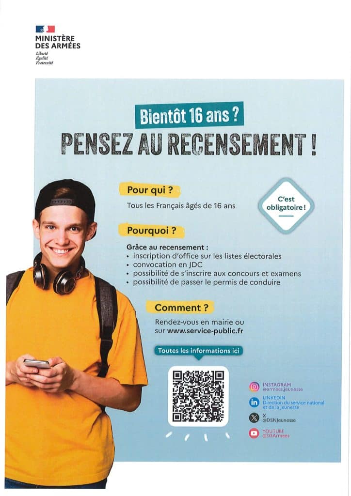 Tout jeune de nationalité française, fille ou garçon, doit obligatoirement se faire recenser auprès de la mairie de son domicile, lors de son 16ème anniversaire ( et au plus tard le dernier jour du 3e mois qui suit celui de l’anniversaire). Alors si votre enfant est concerné, rendez-vous en mairie ou sur https://www.service-public.gouv.fr