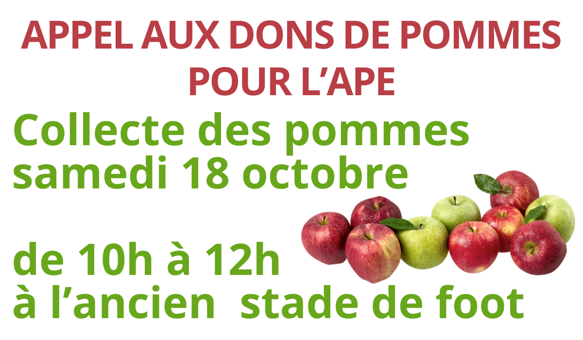 Vos dons de pommes permettront de presser un délicieux jus que nous proposerons ensuite à la vente, au profit des projets de l’Association des Parents d’Élèves. Collecte des pommes