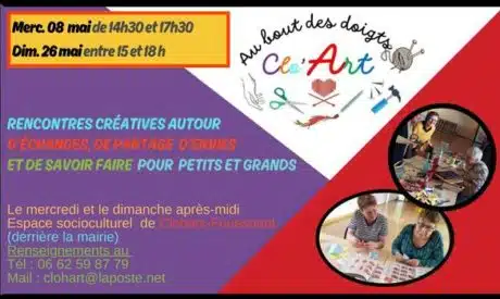 Venez découvrir l'association "Clo'art au bout des doigts" et participer à des ateliers créatifs pour petits et grands. Rendez-vous à l'espace socioculturel (derrière la mairie)…