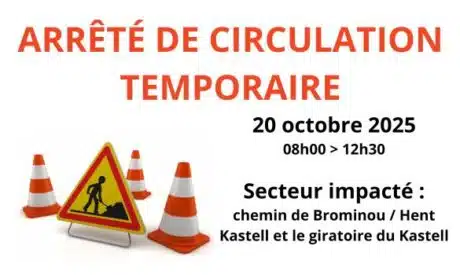 Arrêté temporaire de circulation chemin de Brominou/Hent Kastell le 20/10