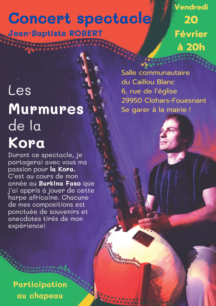 Le Caillou blanc propose le vendredi 20 Février à 20h00 un spectacle concert de Kora interprété par Jean-Baptiste Robert. L’évènement aura lieu dans la salle communautaire du Caillou Blanc.