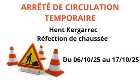 En raison de travaux de réfection de chaussée, la circulation sera interdite Hent Kergarrec sauf riverains du 6 octobre au 17 octobre 2025. Le 9…
