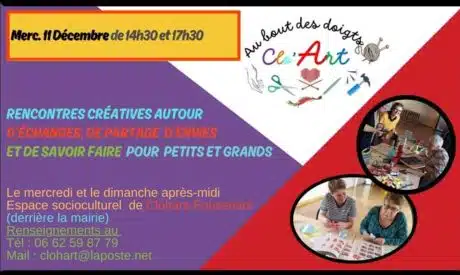L'association " Clo'art au bout des doigts" vous informe que son dernier atelier de loisirs créatifs pour petits et grands de l'année aura lieu le…