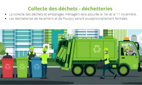 Exceptionnellement, les déchetteries de Kerambris et de Poulpry seront fermées les 1er et 11 novembre. Cependant la collecte des déchets ménagers sera assurée.
