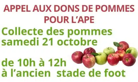 Collecte des pommes samedi 21 octobre de 10h à 12h à l’ancien stade de foot L'APE lance pour la seconde année une opération “jus de pomme”.  Vous…